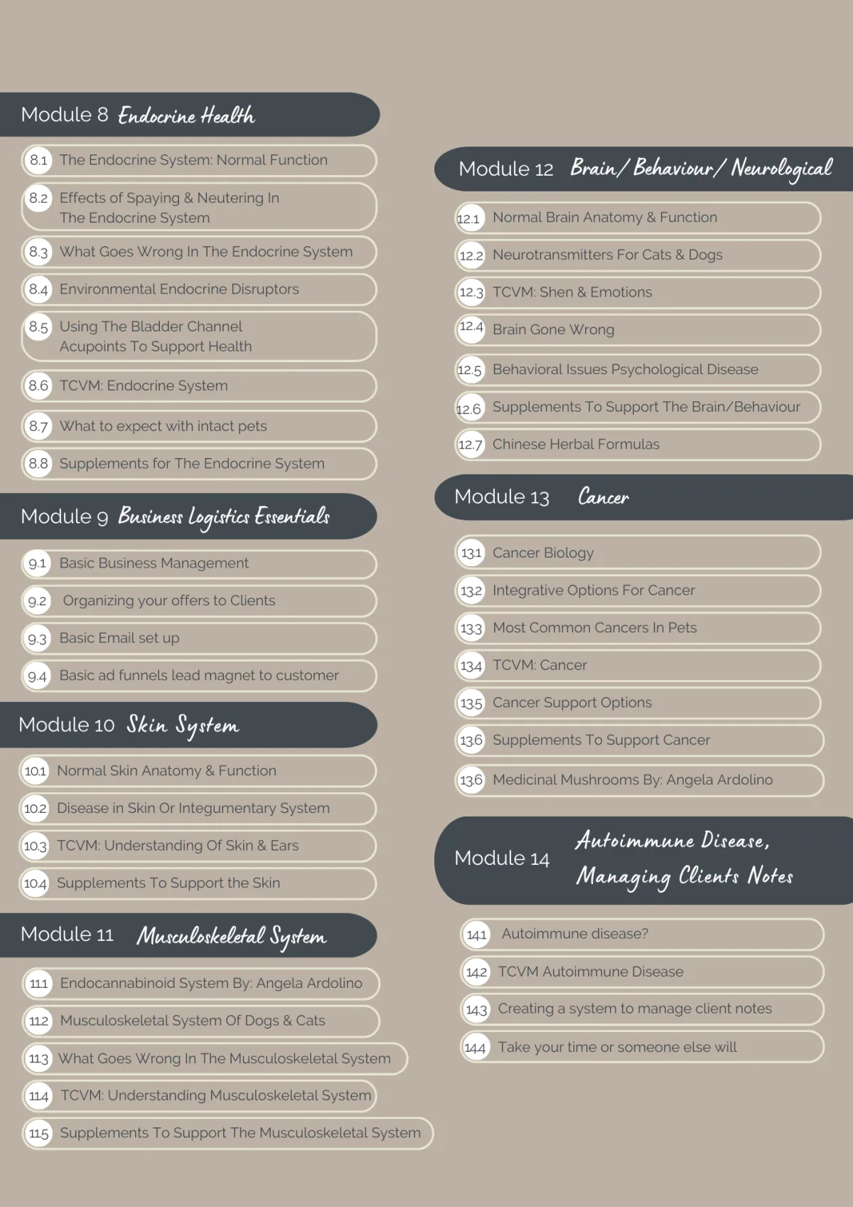 Dr. Ruth's 30+ years of knowledge - Use Dr. Ruth's 30+ years of knowledge in Traditional Chinese Medicine, Functional Medicine, and conventional veterinary medicine to support your client's pets. Dr. Ruth will have your bach during the program and afterward with coaching calls.